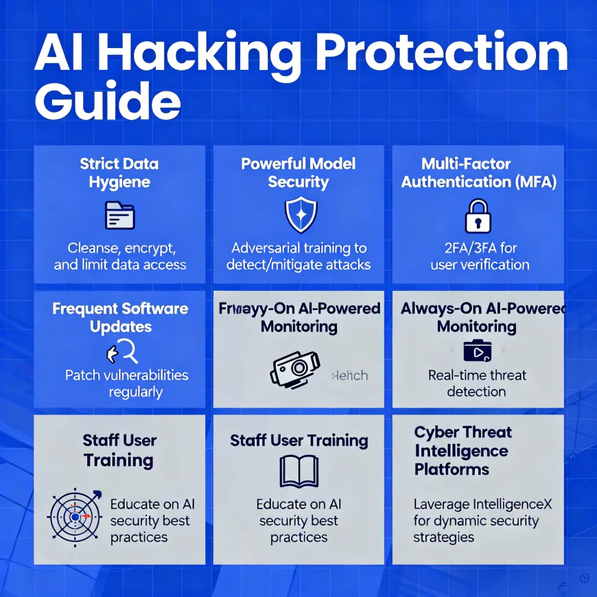 In the battle against AI hacking, a layered cybersecurity strategy is essential that combines tech measures and human vigilance. Here are the main steps: