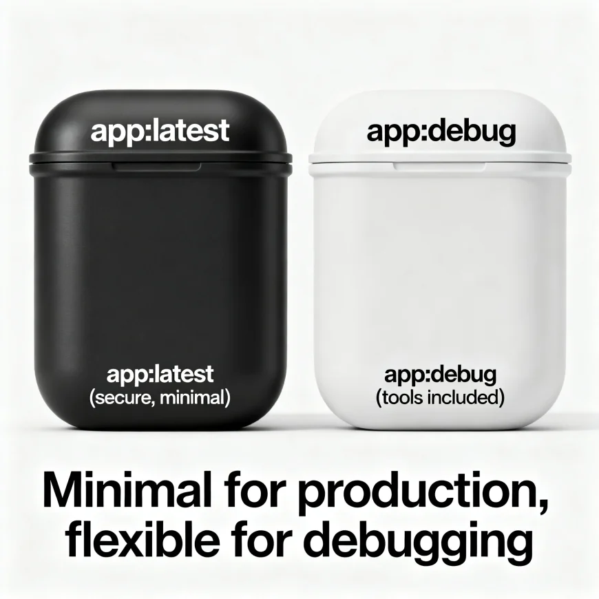 - app:debug → Includes shell and tools for troubleshooting (not deployed in production).