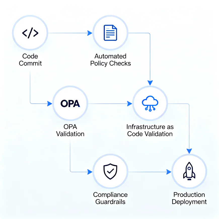 - GitOps: Embedding compliance rules directly into pull requests — so policy violations are caught before merging.