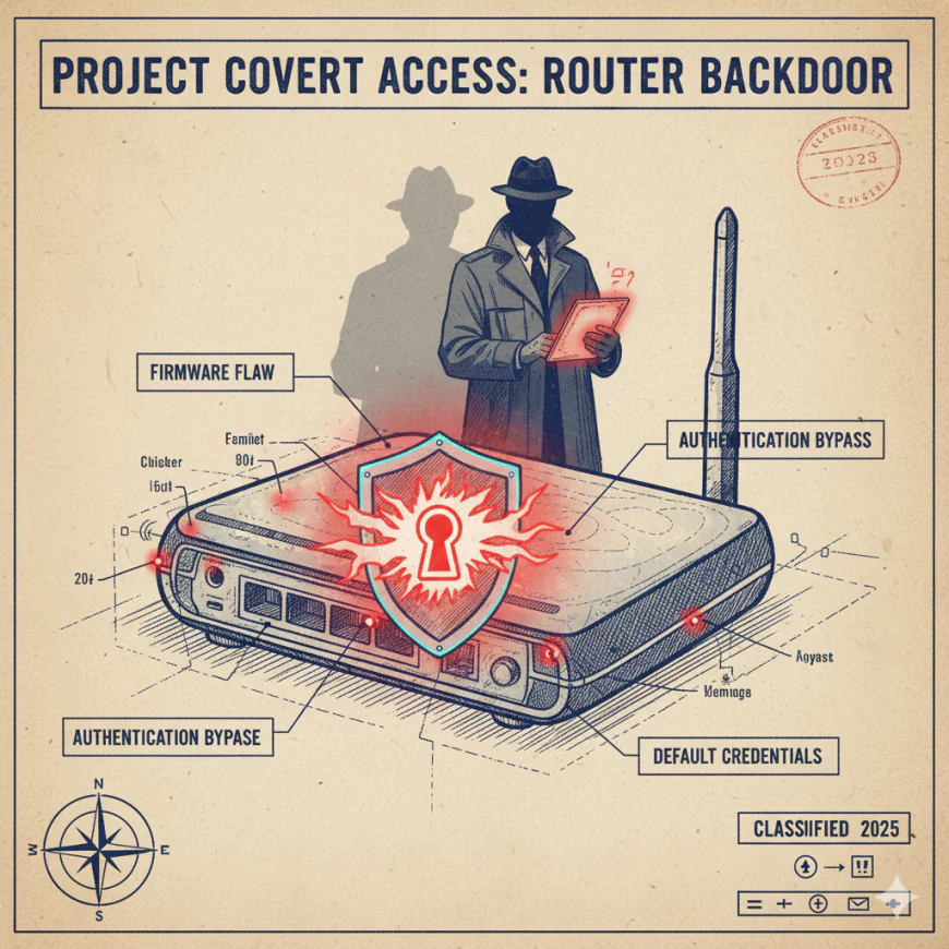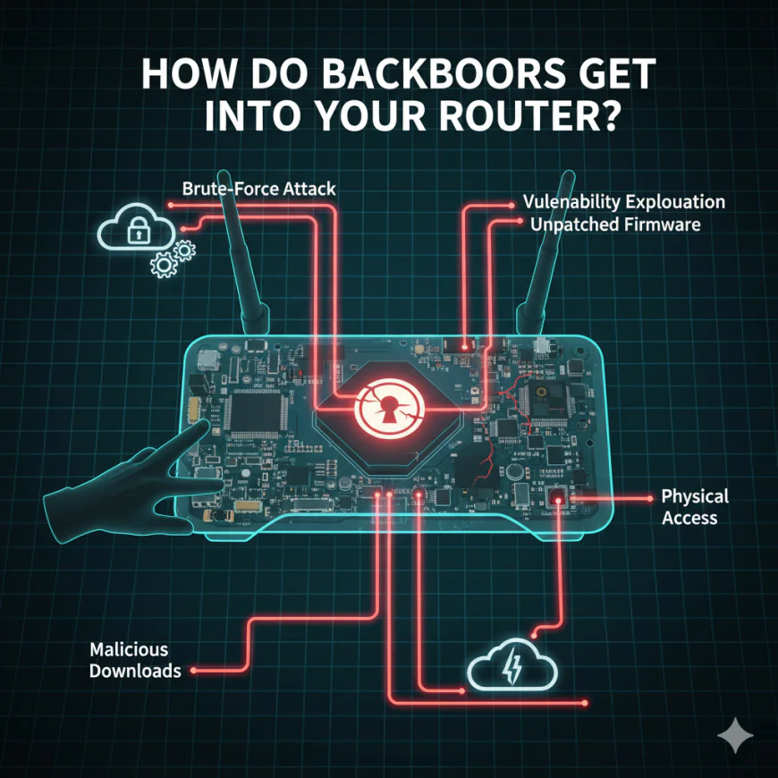 A router's backdoor is a concealed access point that permits attackers to circumvent the usual authentication and take control of your device illegally. A backdoor does not need the password like a regular hack, rather it gives access through weaknesses in the router's firmware or configuration that the normal user never finds out about.