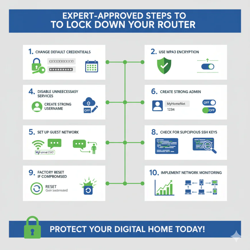 This is the optimistic side of the problem: unlike those complicated cyber attacks that require highly skilled personnel and take a lot of time, the security of routers depends completely on taking simple actions that you can implement at this very moment. Simply change your default credentials, update firmware, use strong encryption, and turn off every unnecessary service. These basic practices eliminate the easiest paths through which attackers gain access to routers.