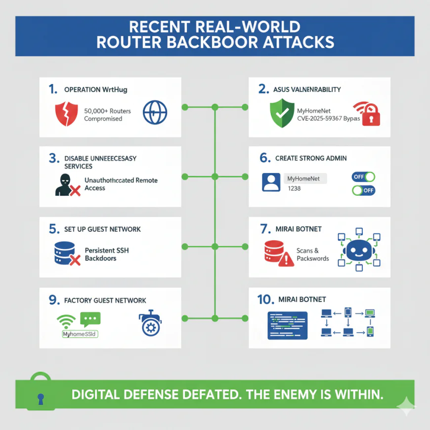 The danger is real and not imaginary. In 2025, the experts in security revealed Operation WrtHug, a series of attacks that affected more than 50,000 ASUS routers worldwide. The intruders took advantage of the known weaknesses to enter the system and then planted persistent SSH backdoors that could not be removed by rebooting or updating the firmware. They did so by switching on SSH on a non-standard port and inserting their own cryptographic keys into the router's configuration.