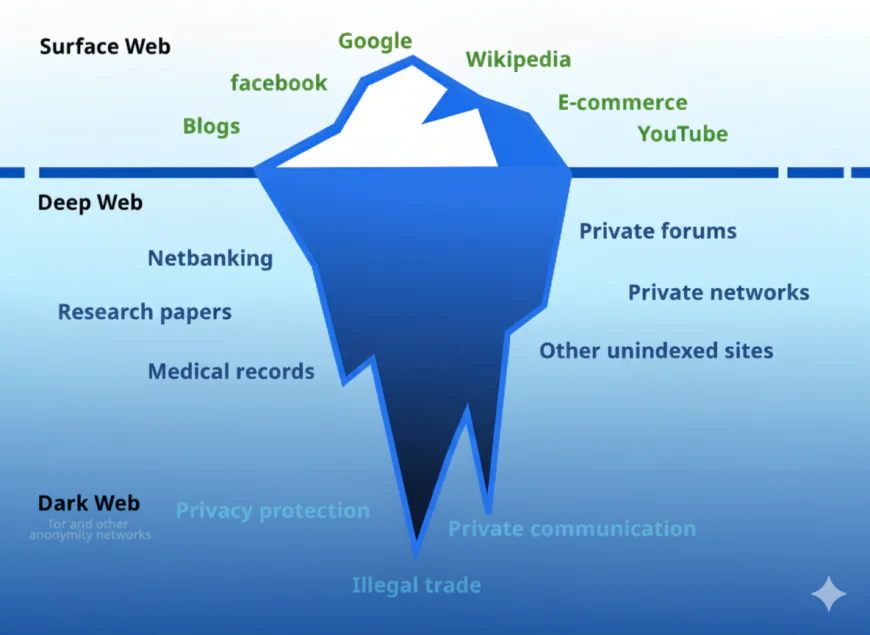 Deep Web: Under Surface Web is the Deep Web, representing approximately 90-95% of the internet. All content not indexed by search engines is surrounded by the deep web. This includes password-protected sites, private databases, academic journals behind paywalls, medical records, personal email inboxes, and corporate intranets. To access the deep web content proper credentials, direct URLs, or institutional access are typically required.